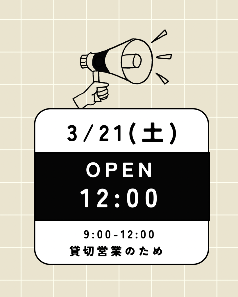 お知らせ 2026年3月19日 ご予約頂いたお客様と連絡が取れることができました。ご協力いただいた皆様ありがとうございました。 3月21日の9時から12時まで貸切営業のため、12時からのオープンとなります。お間違えないようお願いします。